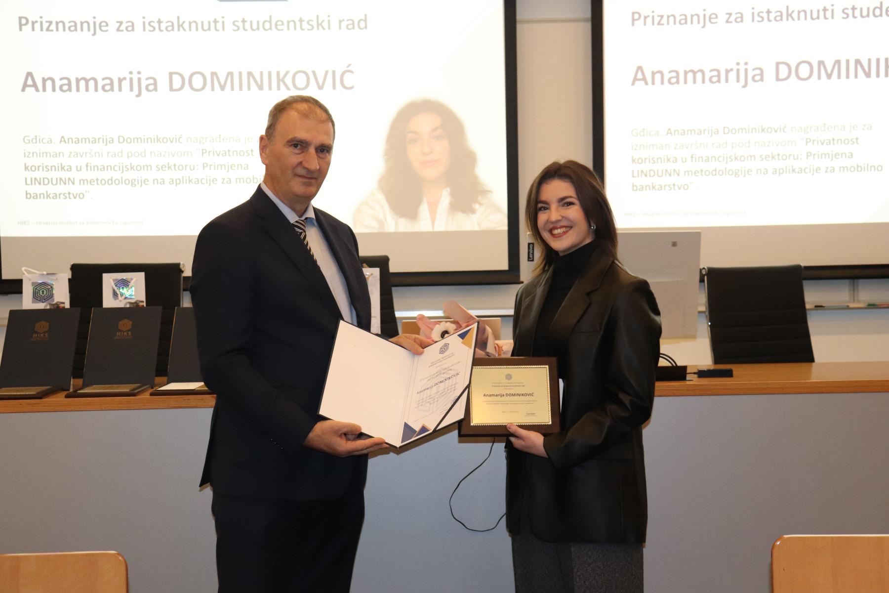 Gđica. Anamarija Dominiković nagrađena je za izniman završni rad pod nazivom "Privatnost korisnika u financijskom sektoru: Primjena LINDUNN metodologije na aplikacije za mobilno bankarstvo". - Priznanje za istaknuti znanstveni rad dodijeljeno je gosp. Miljenku ŠVARCMAJERU, Fakultet Elektrotehnike, računarstva i informacijskih tehnologija Osijek.